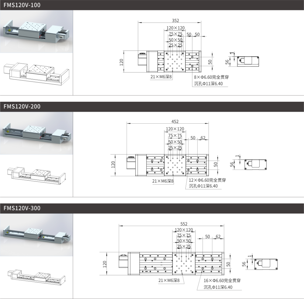 多种行程可选,满足更多应用需求: 提供 100mm、200mm 和 300mm 三种行程选择,结构紧凑,可灵活集成于各种应用场景。